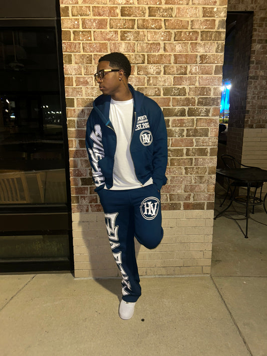 “ HUSTLE VIBEZ “ Navy blue and white Winter Set! ( Crop jacket + Stacked joggers)